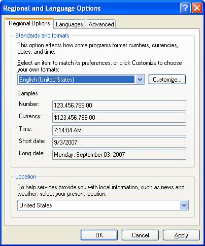 Update: See Item 21 above. Regional Number Settings: We have documented a problem using EuroJOC on some (but not all) German versions of Windows. When the computer's regional settings are set to the comma (",") as the Decimal Symbol and the period (".") as the Digit Grouping Symbol. The problem appears in the form of error messages when entering the quantity using the comma into the blue estimate grid. As a temporary workaround, until a permanent solution can be determined, we suggest changing the decimal symbol to period (".") and the digit grouping symbol to comma (","). You should apply this change to both the numbers tab and the currency tab. See the top of the form to change the selected tab. The regional settings can be reached from the Windows® control panel's date, time and regional settings icon. When you see the form shown on the right, you will know you are in correct place. You might also consider creating a new user on your machine and logging on as that user when you need to work in EuroJOC. |