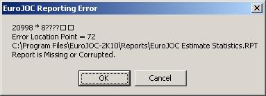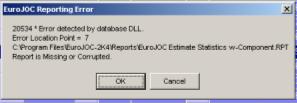 3/28/2008 Error 20534 Occurs when printing an estimate or proposal. This error occurs when the contract file does not match the report's expected format or the contract file is corrupted. This can be avoided by not opening or changing the contract file using MS Access and all users accessing the file be using the same or latest version of the EuroJOC software. A simple way to correct the problem is to create a new contract file and then using the 'Import Project from Another Contract File' utility on the Main form's 'Project' menu, import all the projects into the new contract file. |