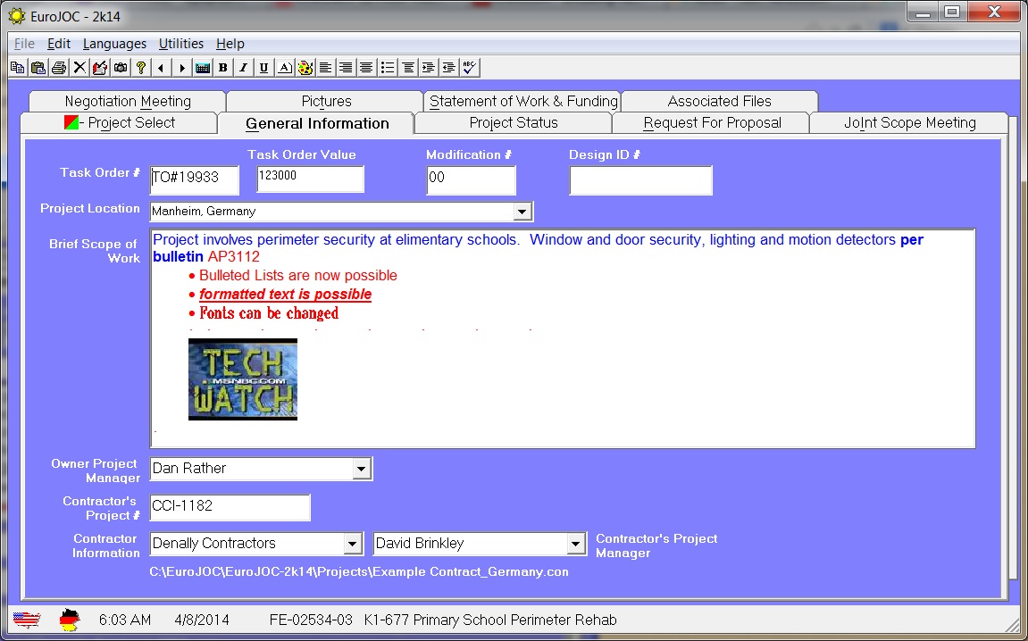The main form is EuroJOC's framework for storing project related information. By the tabs shown above, you get an idea of all the different data that can be stored. EuroJOC works well with other editors too. Use your favorite editor and then paste the information into EuroJOC. Each tab has its own report, select the tab and click the printer icon to produce the related report. EuroJOC's features have been designed to work independently. Work as you wish, not as the program requires. Main form features are also available within the estimate builder. EuroJOC Features Include: