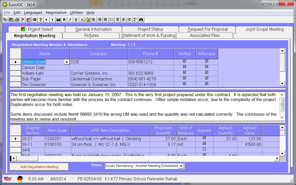 Recent changes to the 'Negotiation Meeting' tab of the main form include adding a second grid for recording the item by item results of the negotiation meeting. Grid features include a search engine and three import sources for items. The grid can import items from estimates, proposals, and previous negotiation meetings. Each grid row includes a 'Notes' cell capable of storing 10 pages of text. The attendance grid is tied to the contacts database so that only the name and checkboxes need to be selected.