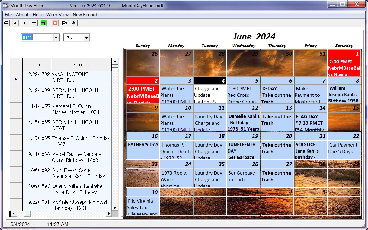 CorVet Systems - Month Day Hour Calendar program - June 2024 |