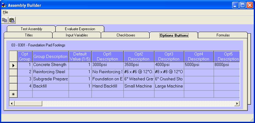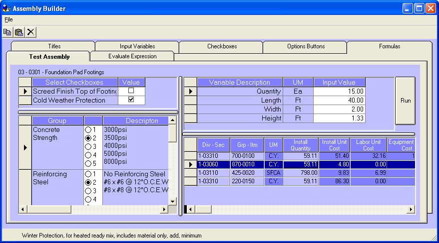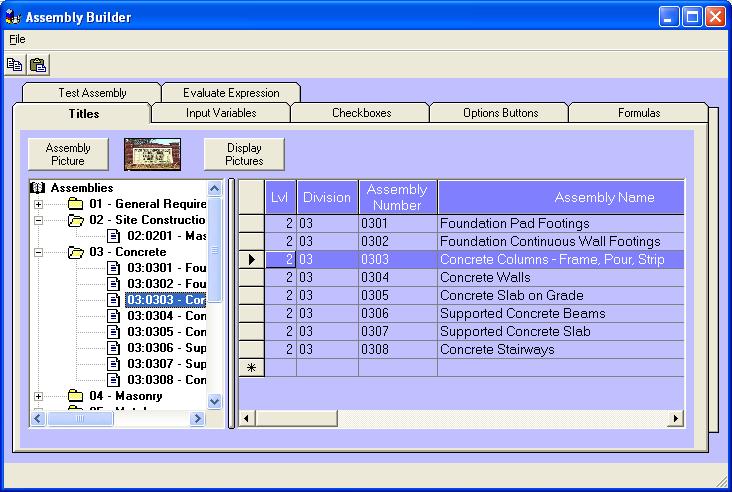 The Titles tab is used to create assembly titles and link pictures to the assembly. This tab is also used to select the assembly being created or modified within the other tabs. It is possible to clone an assembly, thus reducing the time to develop a similar assembly. Multiple pictures can be used to graphically represent what is represented by each assembly. Material selection options can be shown, and the input variables can be diagrammed for easy use. |