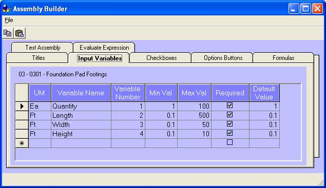 | On the 'Input Variables' tab the variables used within the formulas are created and input limits established. Min, max, required and default values reduce the formula building work necessary to create an assembly. |
