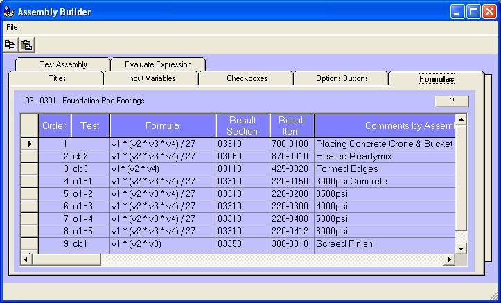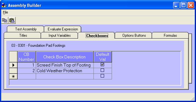 | The checkboxes tab creates on/off selections for the user to select. The checkboxes control whether formulas are used and quantities calculated. Thus the assembly builder can turn on and off entire sections of the calculation with a simple yes or no answer from the assembly user. |