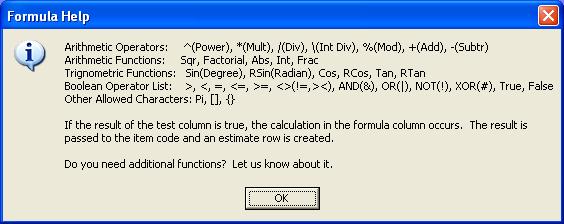 | The formula tab is where all the variables, checkboxes and radio buttons come together. The test column is used to decide whether the calculation occurs. If the calculation test passes the calculation formula is run and the results are passed to the cost item code described in the section and item columns. The message box below describes the operators available when building the tests or formulas. |