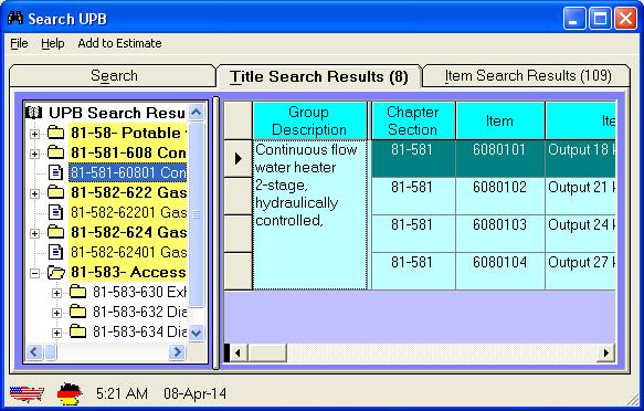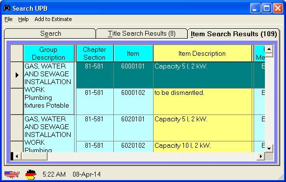 A new addition for 2014, is the Division dropdown selection box. Division selection allows the user to enter a more general search and only search divisions of the UPB the user is interested in seeing the results. The search results are presented in grid format on the two remaining tabs located on this form. Titles matching the search are presented in a title tree and the related cost items are shown in a grid next to the tree. Cost items can be quickly added to an open estimate by double clicking on the selected item. The conjunctive words 'and', 'or' and 'not' form powerful phrases to enhance the search capabilities. The search form builds powerful SQL search queries for fast reliable data searches. The tab system allow the user to select either the title or item results. It is very easy to change the search criteria and start the search again. Another search engine is available for advanced searches. |