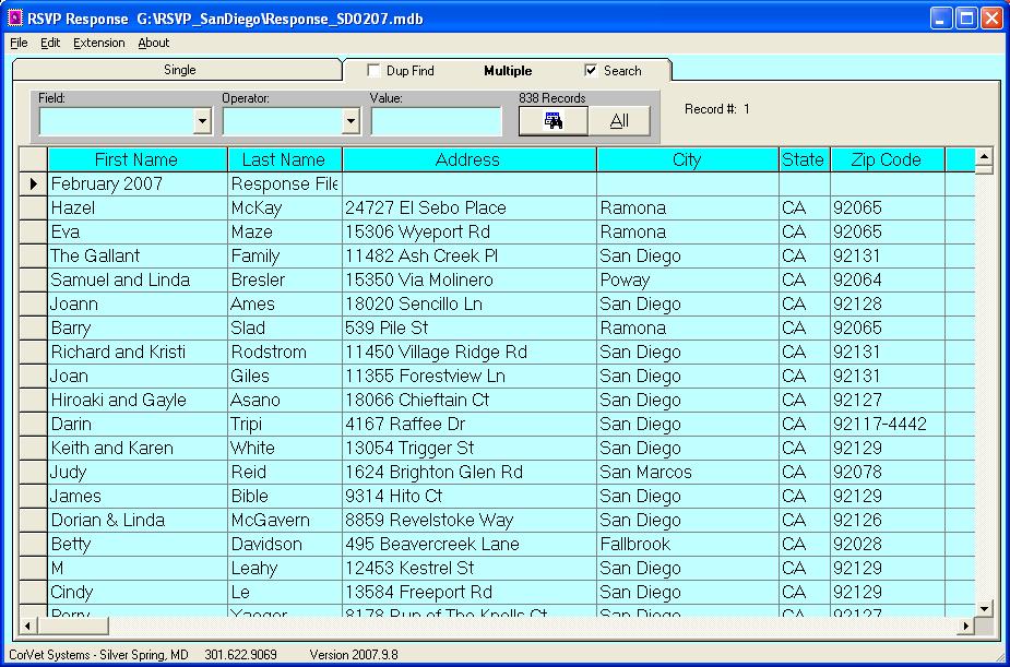 The multiple record view shown below allows the user to view multiple response records. The user can sort the data by clicking on any column heading. The multiple record view provides tools used to search for individual records or to remove duplicate responses from an individual by name or address criteria. |